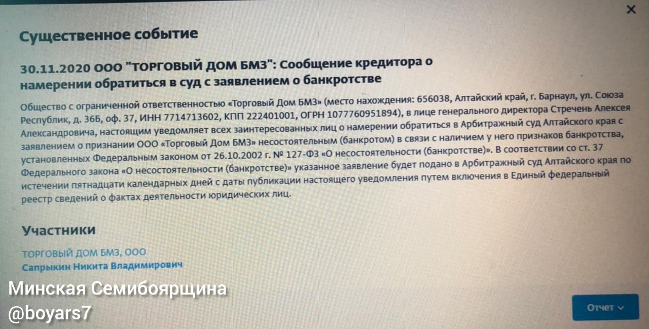 Начался активный исход – вывод капитала и собственности, которая управляется группой Семашко. «Первой ласточкой» стал торговый дом Белорусского металлургического завода. Нет необходимости доказывать преднамеренность этого «банкротства». Весьма печально, когда успешная компания и крупнейший налогоплательщик волею группы коррупционеров направляется в небытие вместе с десятками миллионов долларов народных денег.
