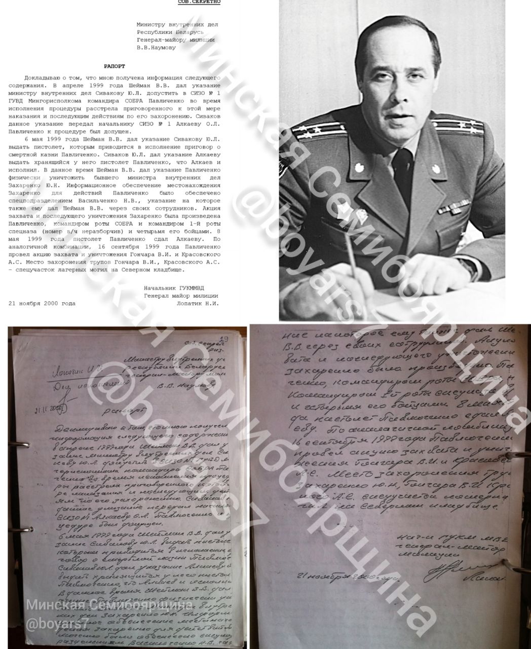 21 ноября 2000 года начальник криминальной милиции генерал Николай Лопатик направил министру внутренних дел Беларуси Владимиру Наумову рапорт под грифом «Совершенно секретно» (прилагается). По результатам оперативно-розыскных мероприятий генерал Лопатик проинформировал министра об обстоятельствах похищений и убийств политиков Юрия Захаренко, Виктора Гончара и Анатолия Красовского.