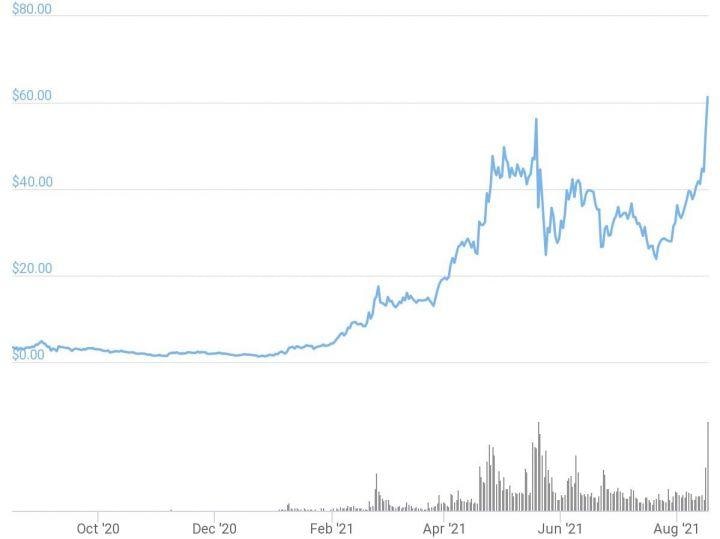 As of press time on Monday (12:14 UTC), SOL is trading at USD 61.4, up 32% over the past 24 hours. The impressive rise marks a new all-time high for the token, smashing through its previous high from May this year of just over USD 58. It had reached USD 63.7 earlier today, having dropped 3.1% since.