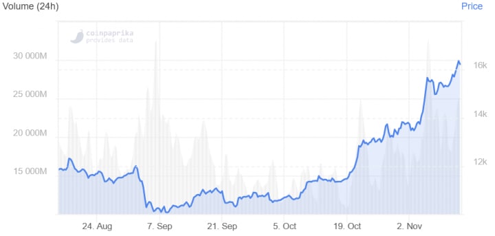 Bitcoin has made quite a move upwards since the beginning of November, with analysts predicting further volatility, but also appreciation in this month. The world's number one coin surpassed the USD 16,000 level for the first time since January 2018 just yesterday, and today jumped above USD 16,400 before correcting lower.
