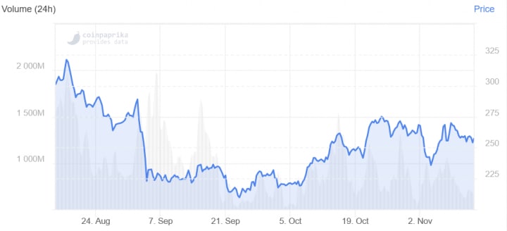 At the time of writing (14:24 UTC), BCH, ranked 6th by market capitalization, trades at USD 257 and is down by almost 1% in day and is unchanged in a week and a month. The price is down by almost 9% in a year.