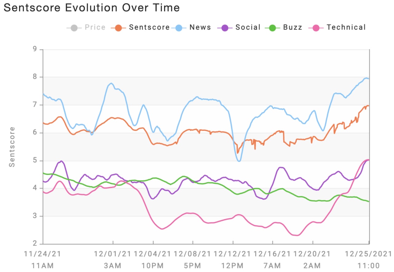 The 24-hour view shows an even stronger average sentscore than the weekly view, indicating that the market is becoming increasingly bullish on these ten major cryptoassets. The average sentscore for the past 24 hours stood at 5.72, compared to a weekly average of 5.16.