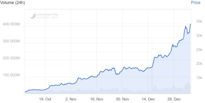 At pixel time (08:28 UTC), BTC trades at USD 34,680 and is up by 10% in a day and 22% in a week, increasing its monthly gains to 85%. Bitcoin reached the USD 30,000 level on January 2.