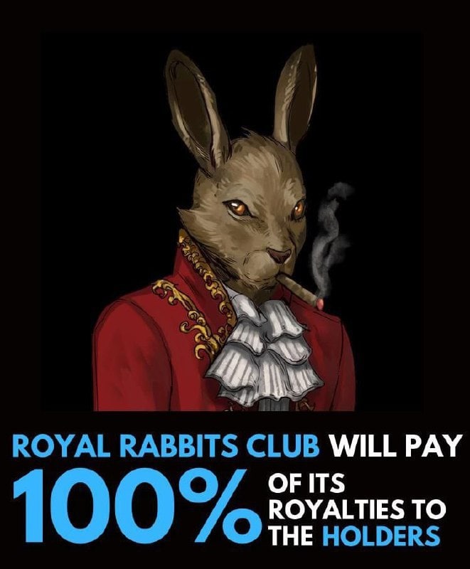 Royal Rabbits Club Will pay 100% of the royalties from OpenSea and any other nft platform to the community! You’ll get paid ETH every month!