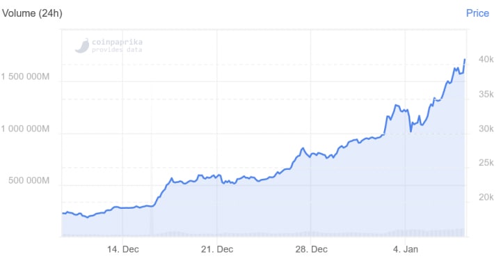 At the time of writing (09:14 UTC), BTC trades at USD 41,067 and is up by almost 128% in a month and 405% in a year.