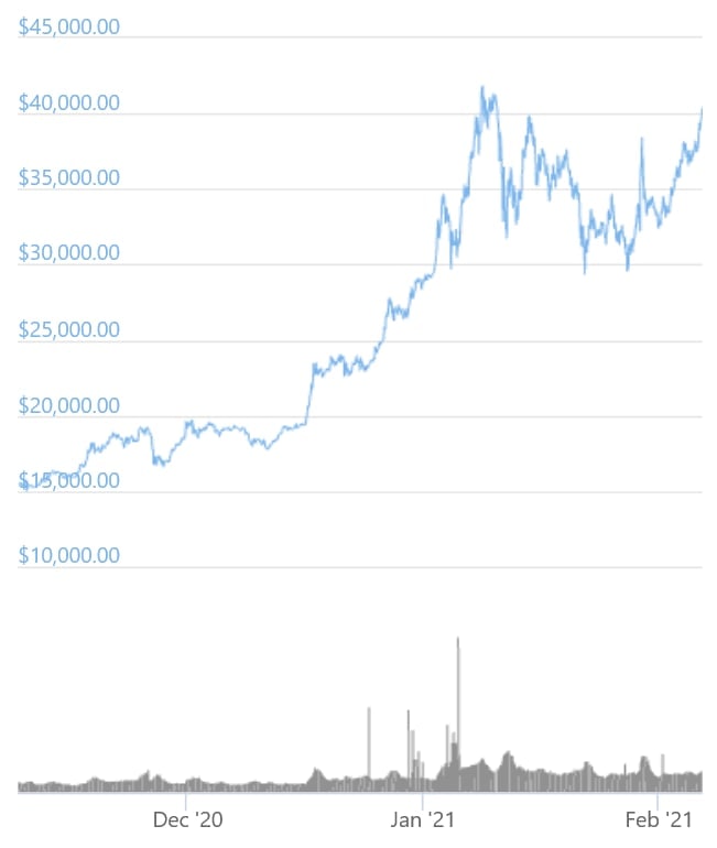 At the time of writing (09:14 UTC), BTC trades at USD 41,067 and is up by almost 128% in a month and 405% in a year.