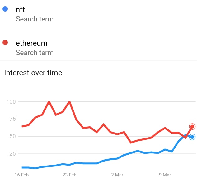 The first-in-history is better seen on the 30-day chart, showing 'nft' shooting up six days ago and surpassing 'ethereum' soon after, before the latter reclaimed its position (however, it represents data only until March 13.)