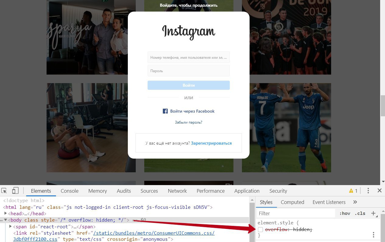 В веб версии Instagram, после нескольких пролистываний страницы, появляется окно обязательной авторизации, перекрывающей весь контент. Но его можно обойти: