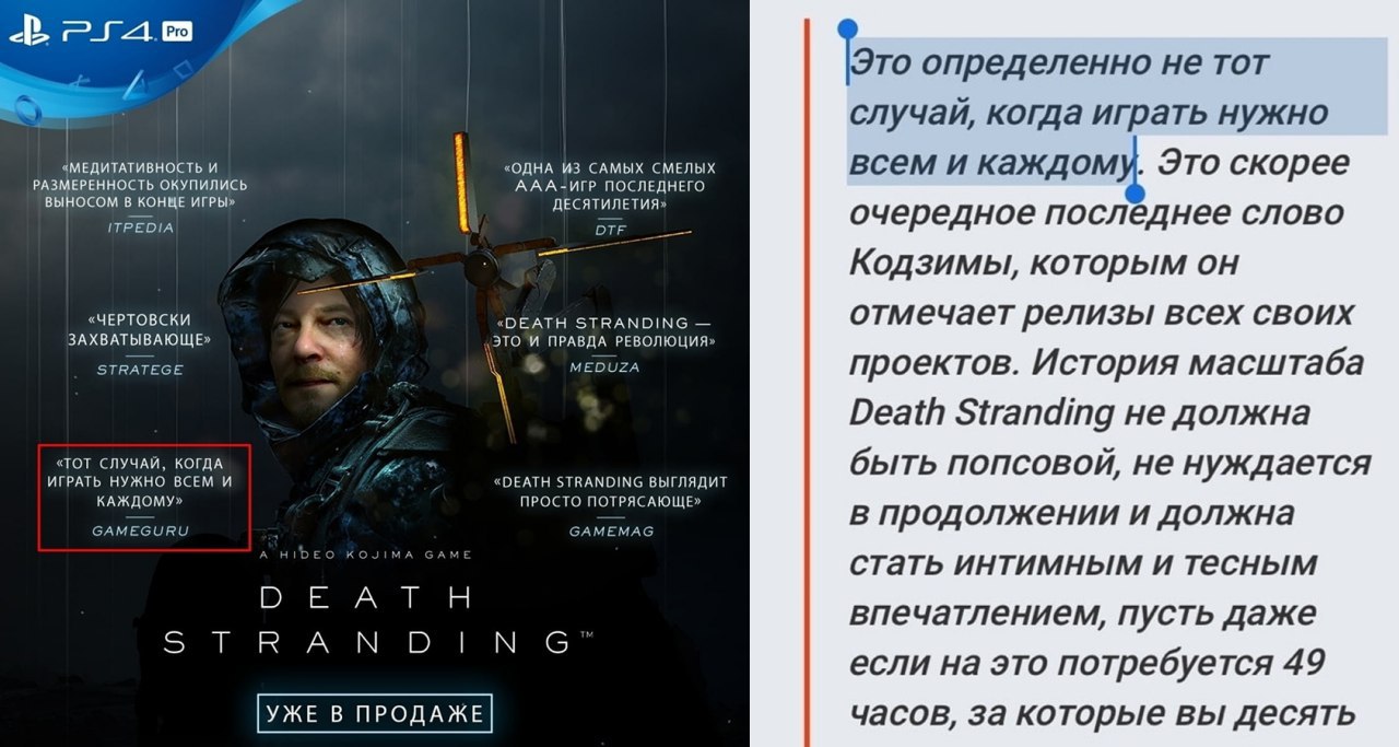 Речь идет об рецензии издания GameGuru к игре Death Stranding, которая вышла 8 ноября. На рекламном постере отображается фраза: