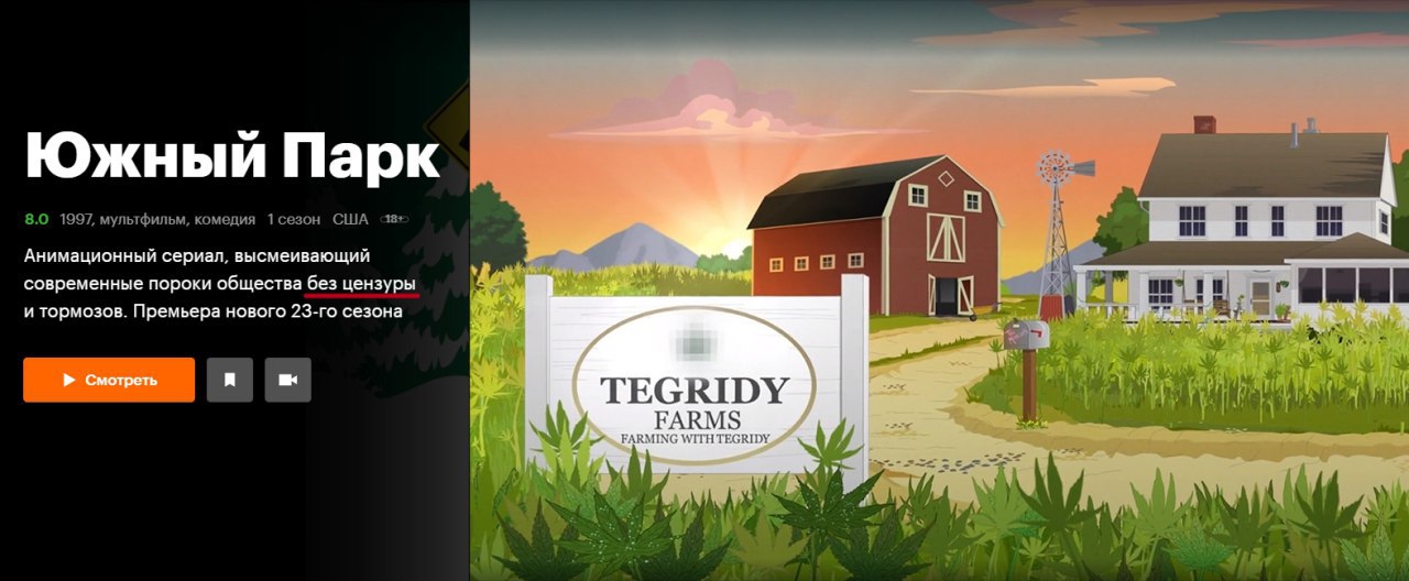 На заставке четвертой серии "Южного парка" фигурирует логотип фермы в виде листка марихуаны. Собственно его и замазали в сервисе "КиноПоиск HD".