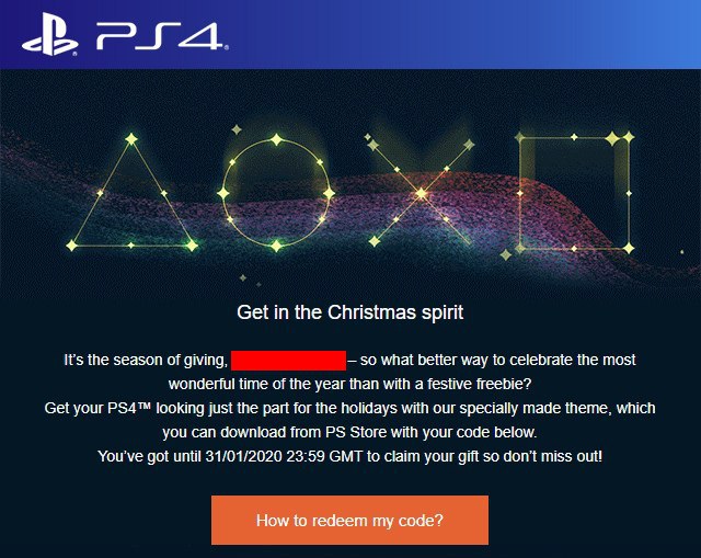 Компания Sony уже рассылает письма на получение новогодней темы в PS4. В письме может содержаться еще и код на скидку в PS Store.