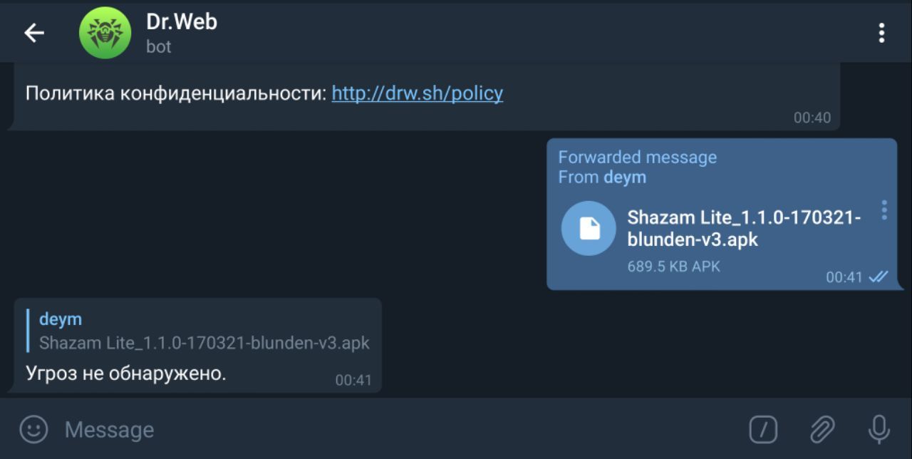 @DrWebBot – официальный бот знаменитого семейства антивирусного ПО. Для проверки файла или ссылки на вирусы, воспользуетесь одним из следующих способов: