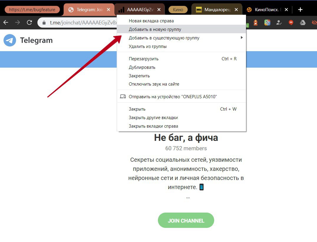После этого, при клике правой кнопкой мыши на вкладку, во всплывающем меню появятся пункты группировки вкладок.