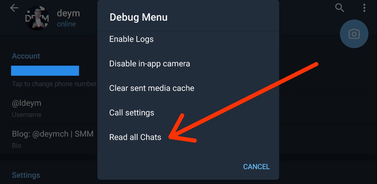 Функция "Read all chats" / "Mark all chats as read" аннулирует счётчик сообщений чатов, каналов и секретных чатов. Чтобы "прочитать" все чаты:
