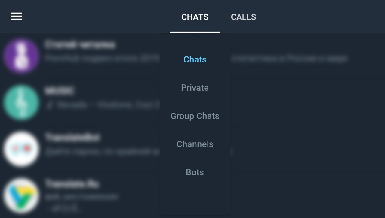 При выборе категории будут отображаться только соответствующие чаты. Другие из меню пропадут. Чтобы отобразить все чаты, выберите категорию "Chats".