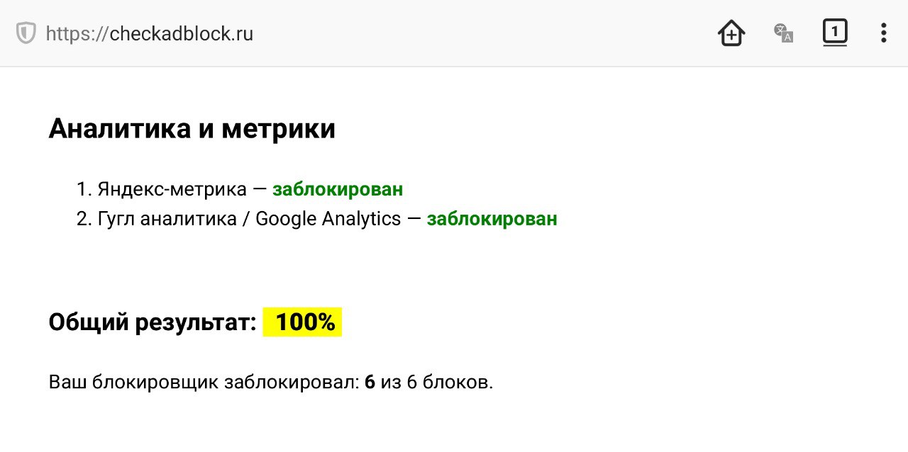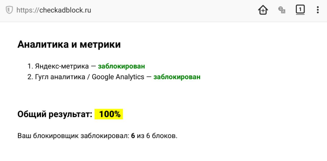 Если результат проверки будет равен 100%, значит ваш блокировщик работает эффективно.