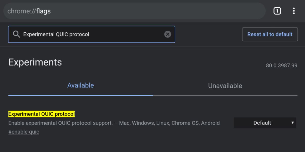 chrome://flags".2. Напишите в поиске "Experimental QUIC protocol".