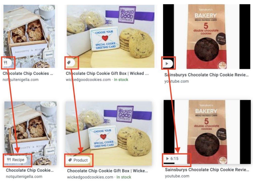 Но компания решила убрать эту плашку, а вместо неё размещать пометки о типе изображения. Например: видео, конкретная временная метка в видео, рецепт, продукт и т. п.