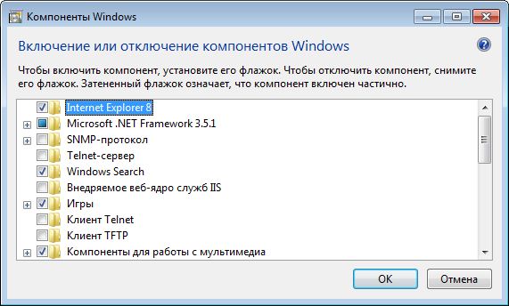 2. Чтобы отключить компонент или программу, снимите флажок. Например с "Internet Explorer" или "Игры".