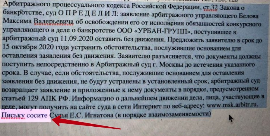 В определении Арбитражного суда Москвы по делу о банкротстве ООО "Урбан Групп" обнаружили скрытую надпись: "письку сосите".