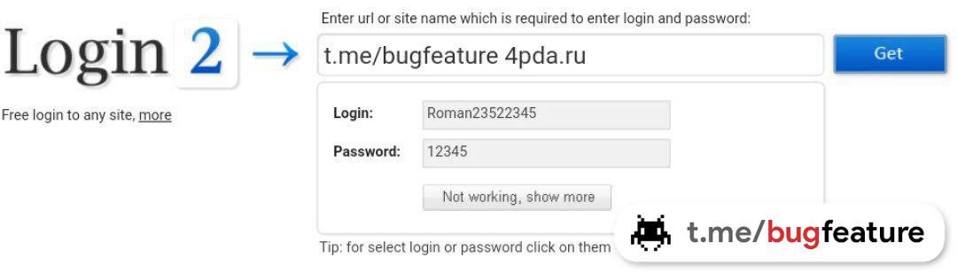 Все что нужно — перейди на указанный сайт. Ввести домен сайта, куда нужны данные для авторизации. Например: 4pda.ru. После нажатия на кнопку "Get" вы получите логин и пароль.