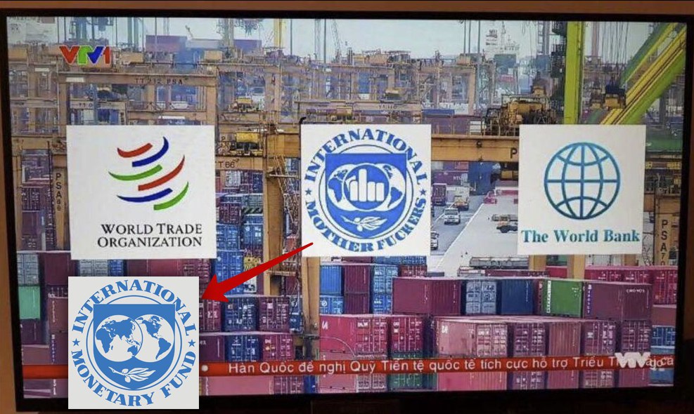 Но вместо реального логотипа Международного Валютного Фонда "International monetary fund" был использован схожий логотип с надписью "International mother f*ckers"