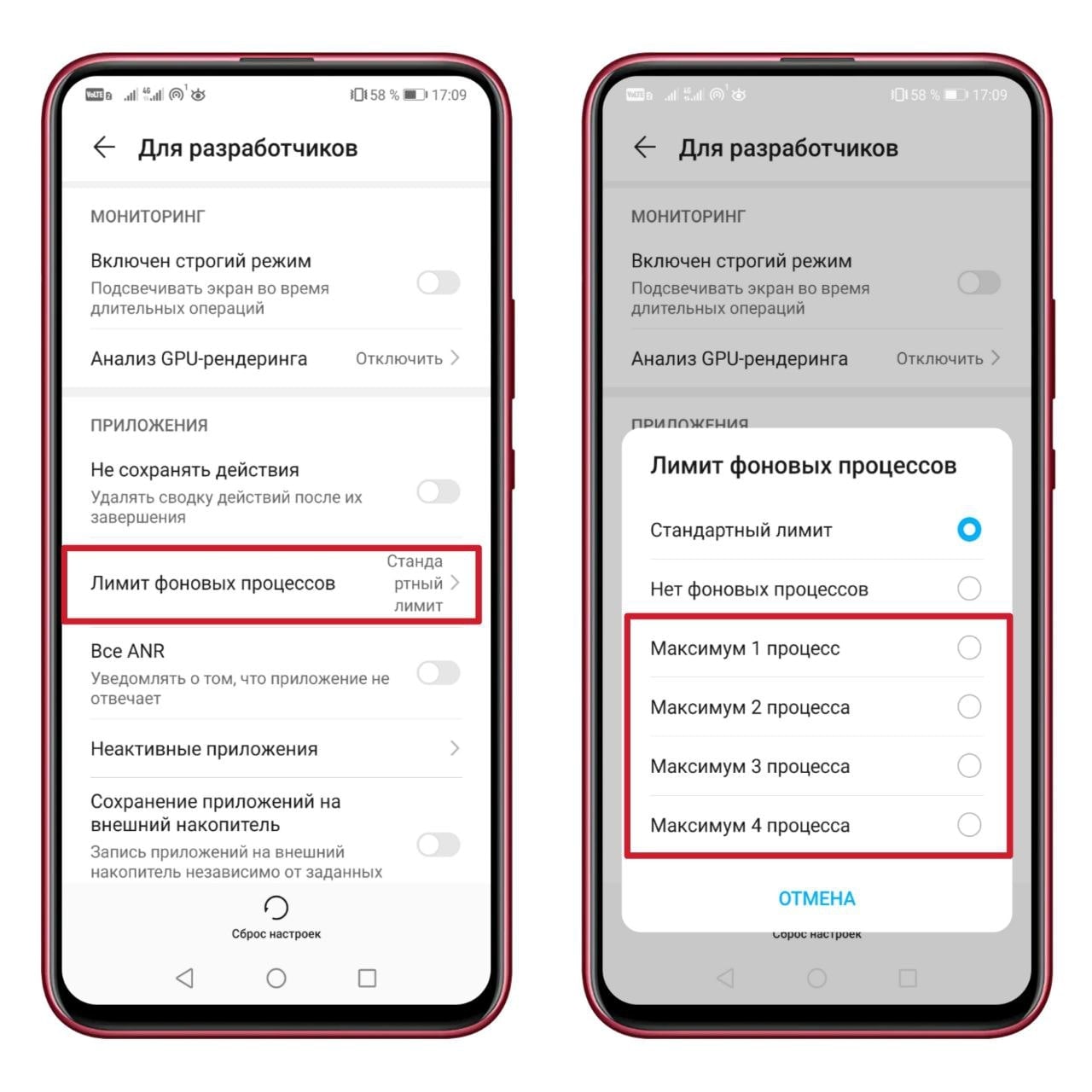 3. Жмем на кнопку "Лимит фоновых процессов" и выбираем, сколько фоновых процессов оставить.