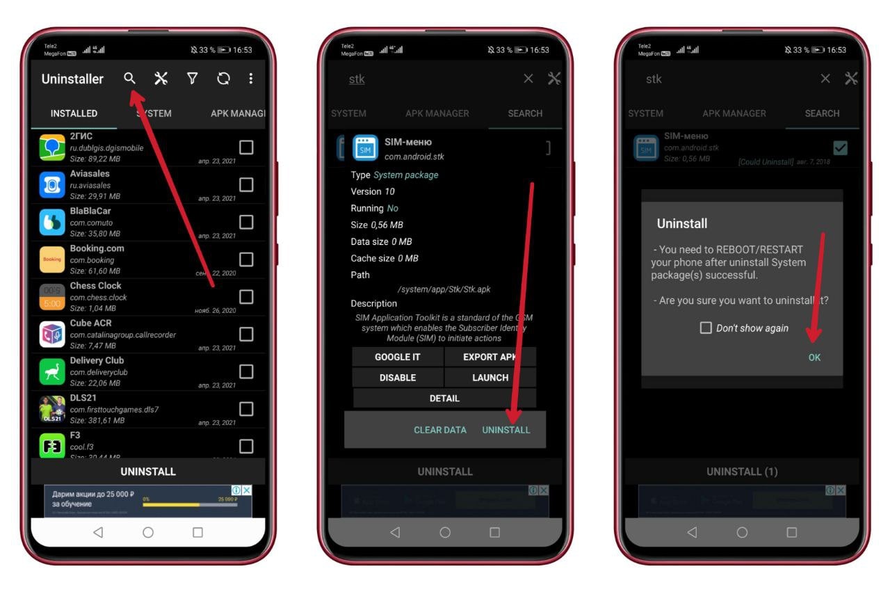 3. Приложение выдаст вам единственное совпадение — "Menu SIM", нажимаем на него, а затем на кнопку "Uninstal"