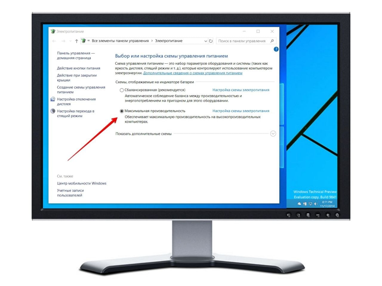 2) "Параметры" > "Система" > "Питание и спящий режим" > "Дополнительные параметры питания" > “Выбор или настройка схему управления питанием” > “Максимальная производительность”.