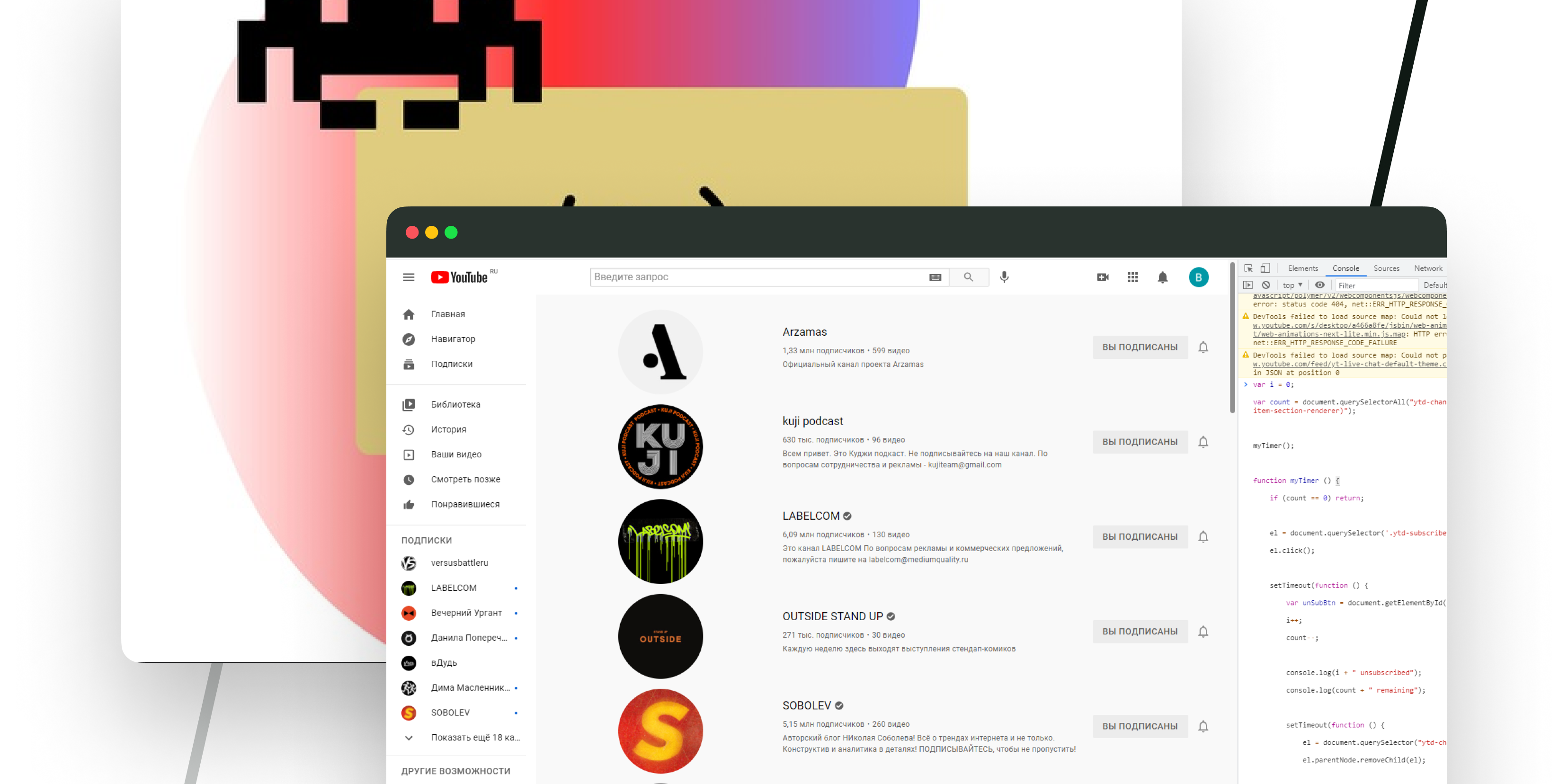 После этого скрипт будет имитировать движения мыши, самостоятельно отписываясь от каждого канала по очереди. Порядок в подписках!