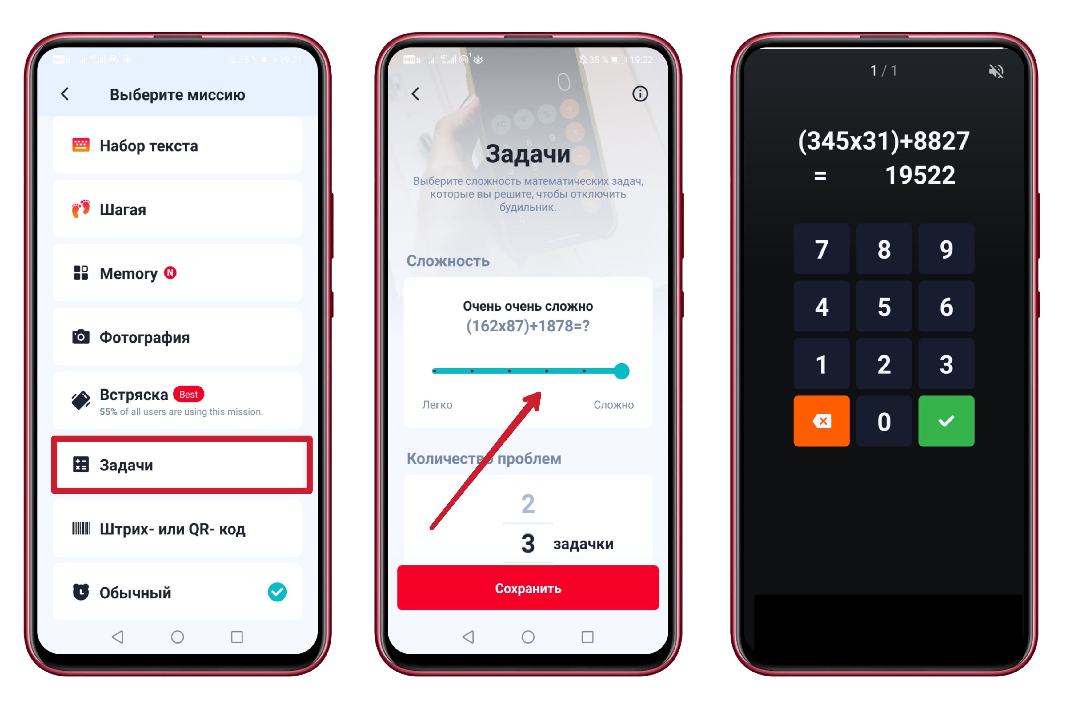 Задачи — это математические примеры, которые нужно решить, чтобы отключить будильник.