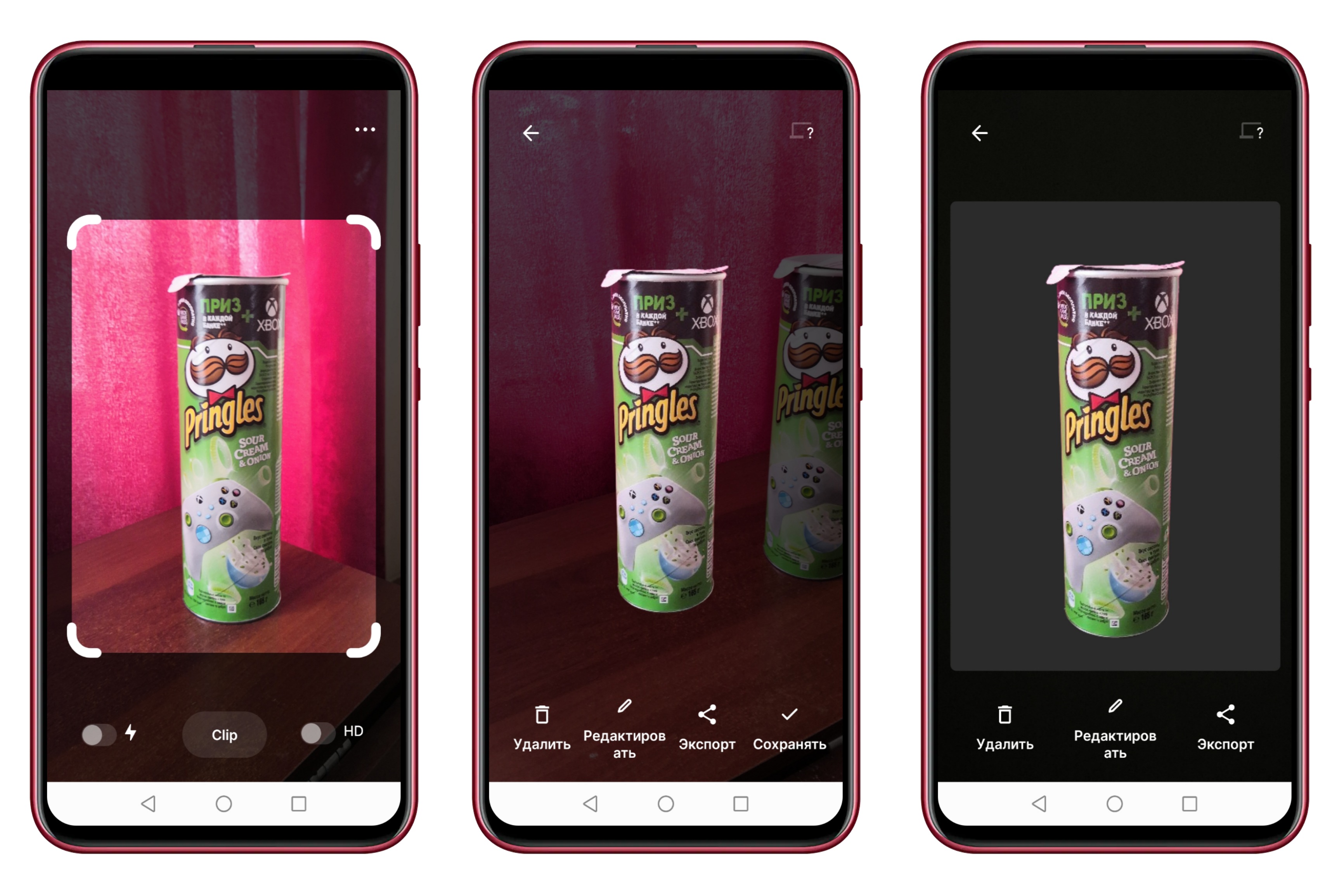 3. Откроется камера. В указанной области размещаем нужный объект и нажимаем "Clip". В течение 5-7 секунд приложение даст вам фото объекта без фона.