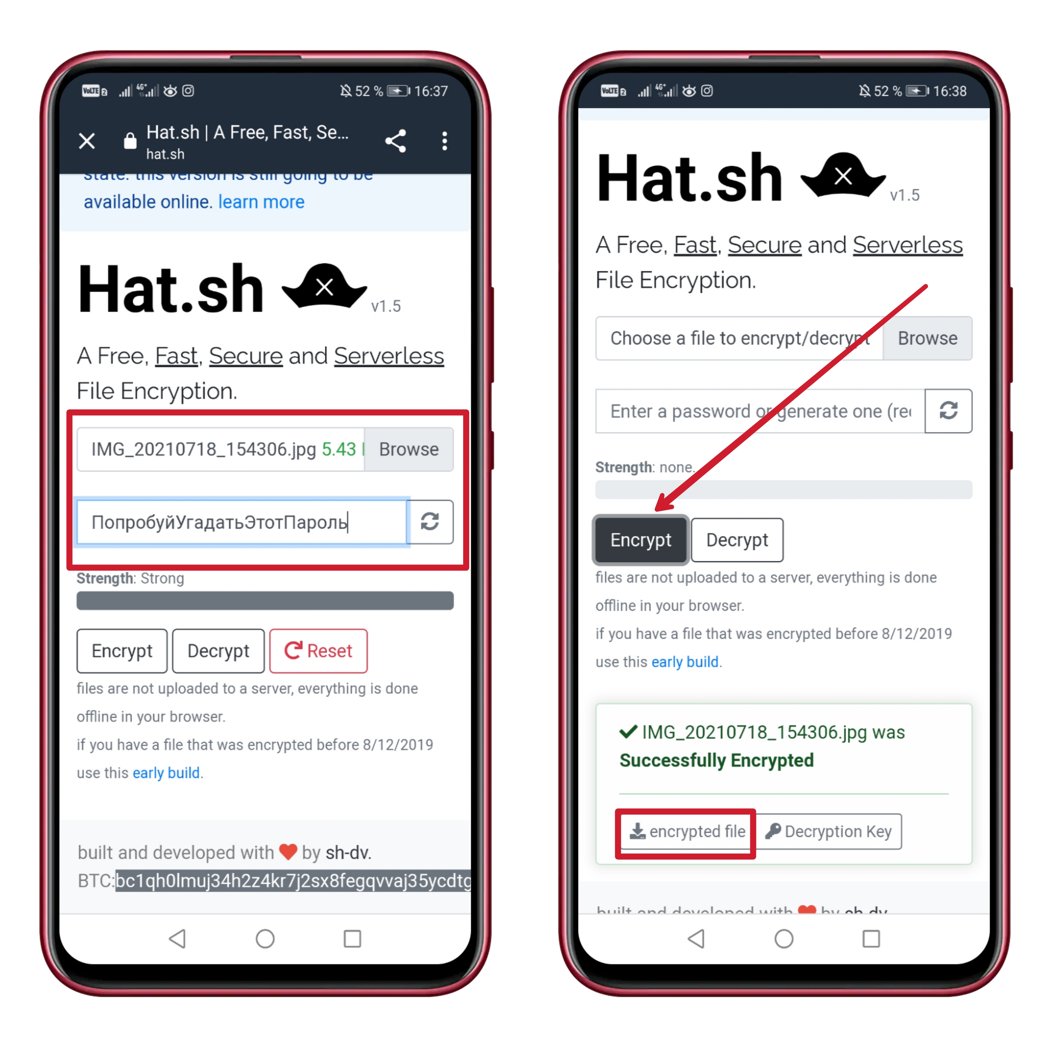 5. Отправляем файл знакомому. Он должен зайти на этот же сайт, загрузить наш файл, ввести пароль, который мы придумали, и нажать на "Decrypt" для дешифрования, а затем скачать. Готово!