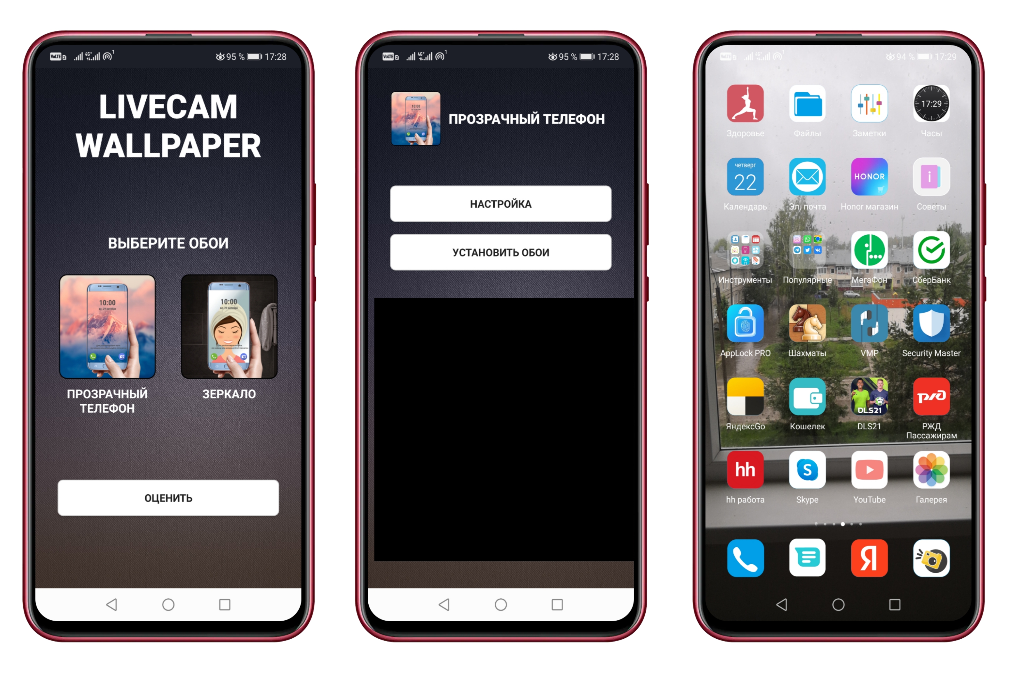 С помощью приложения «Livecam Wallpaper» вы можете сделать ваш рабочий стол и экран блокировки прозрачным или зеркальным. При этом, если вы три раза кликните на пустое место — смартфон сделает фото.