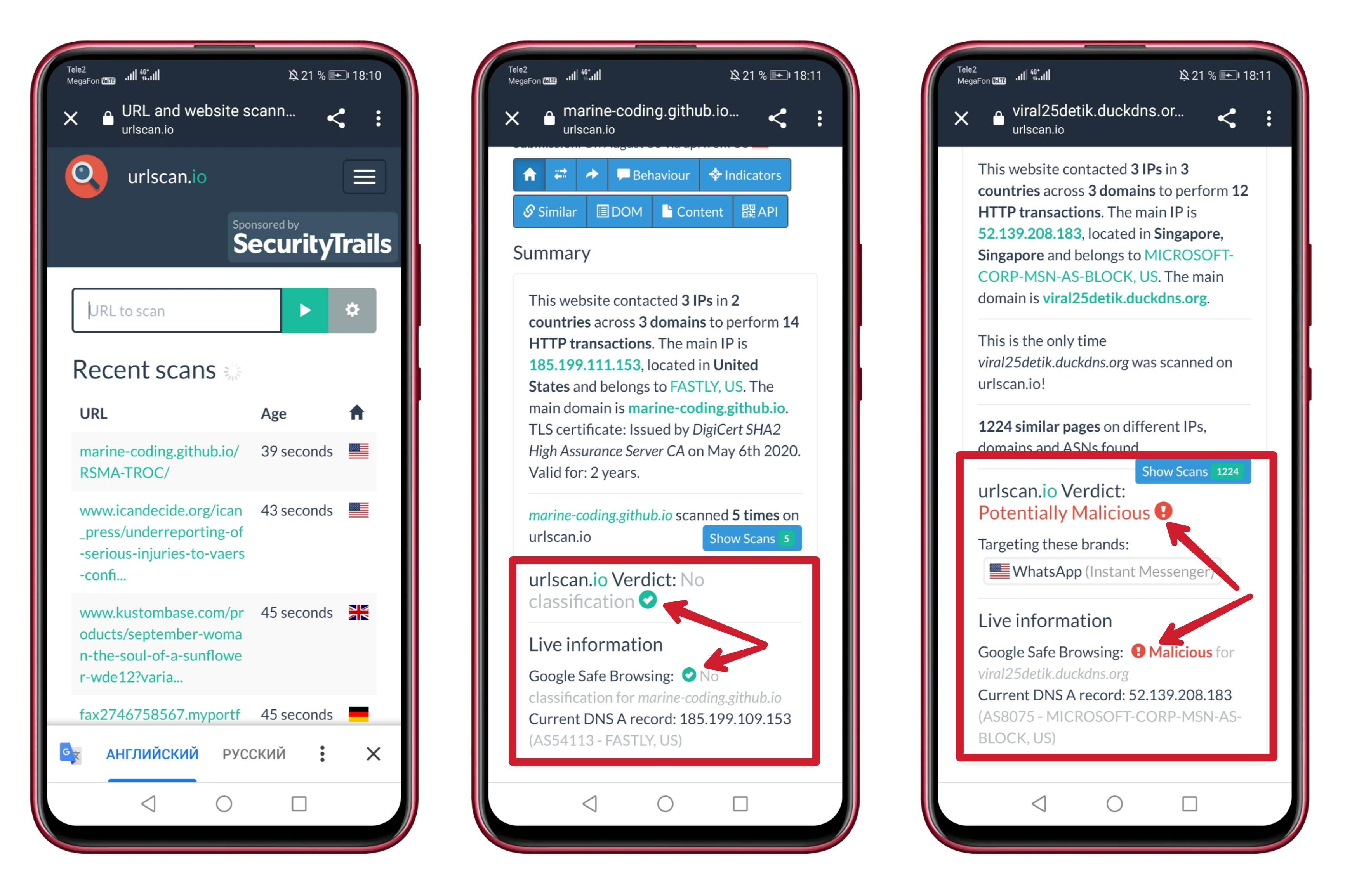 Самое важное — в пункте «urlscan.io verdict». Это вердикт, безопасный сайт или нет. Если всё зелёное и везде стоят галочки, как на втором изображении в скрине, — спокойно используйте сайт. Если нет, как на третьем изображении, — закрывайте вредоносную страницу. После этого просканируйте компьютер антивирусом и поменяйте пароли.