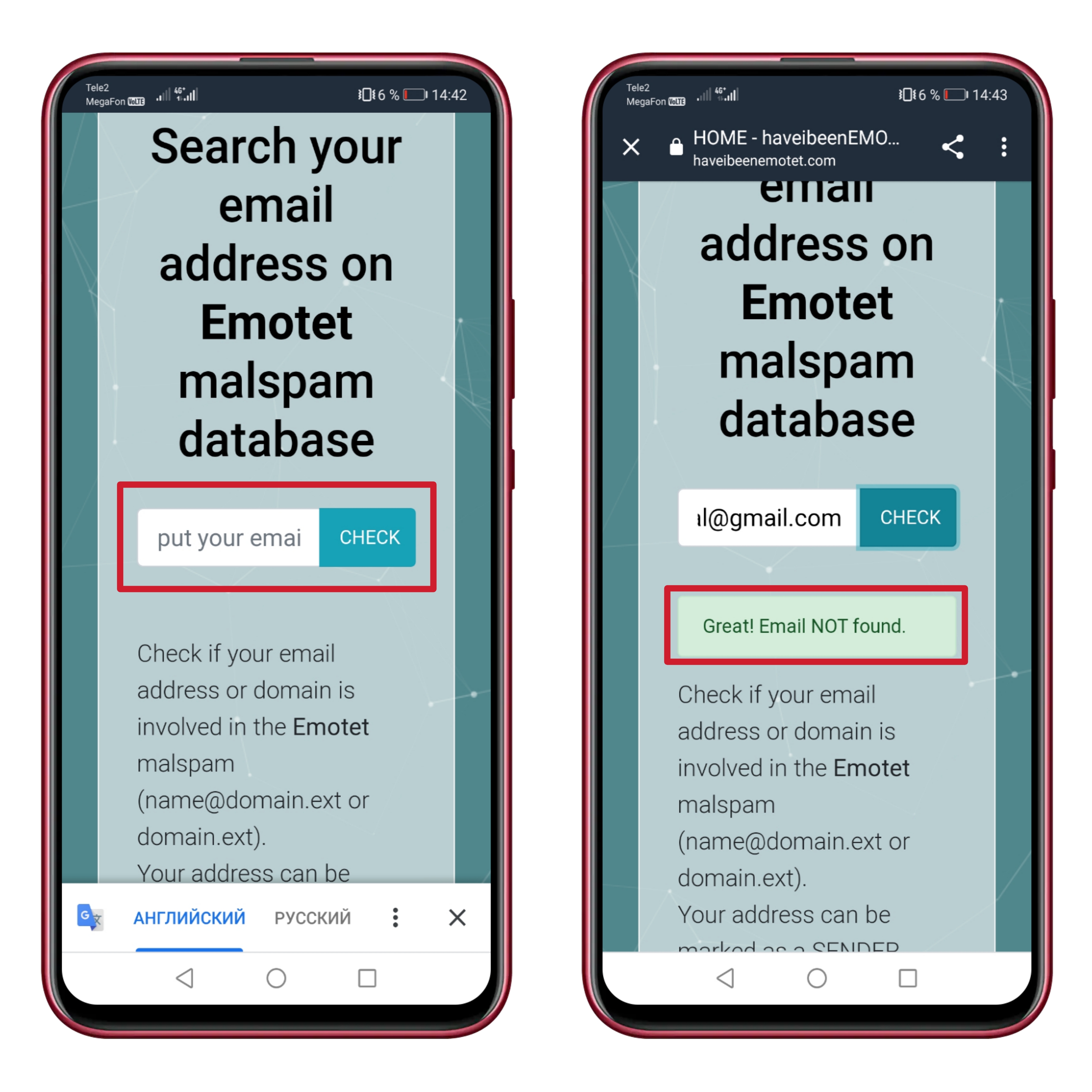 3. Через несколько секунд будет результат: сколько раз вы отправляли или получали спам от Emotet.
