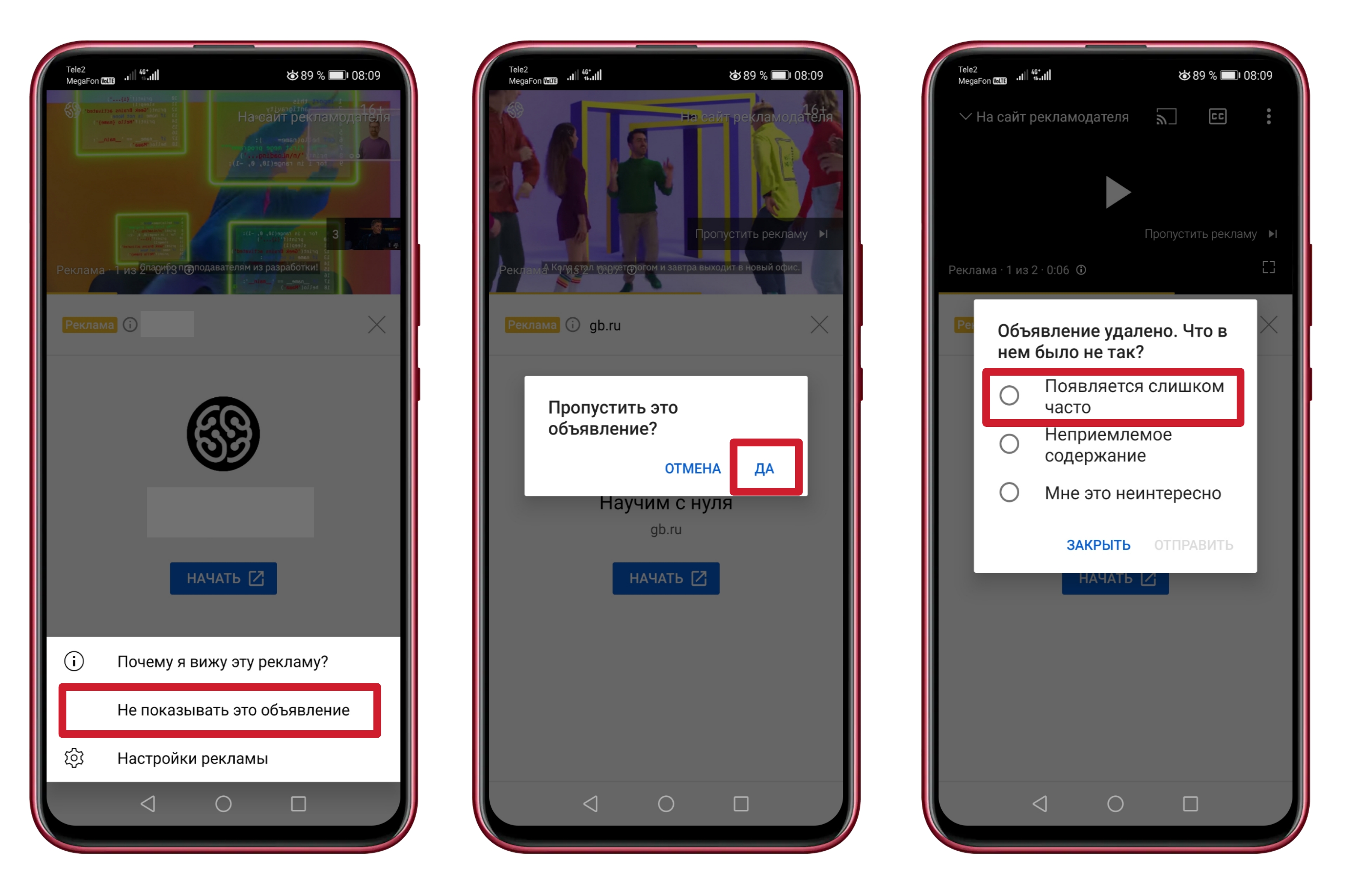 3. Появится новое окно, где нужно нажать "Не показывать это объявление", затем кликнуть на "Да" и выбрать одну из причин пропуска. Выбираем "Появляется слишком часто": после других ответов может потребоваться подробное разъяснение.