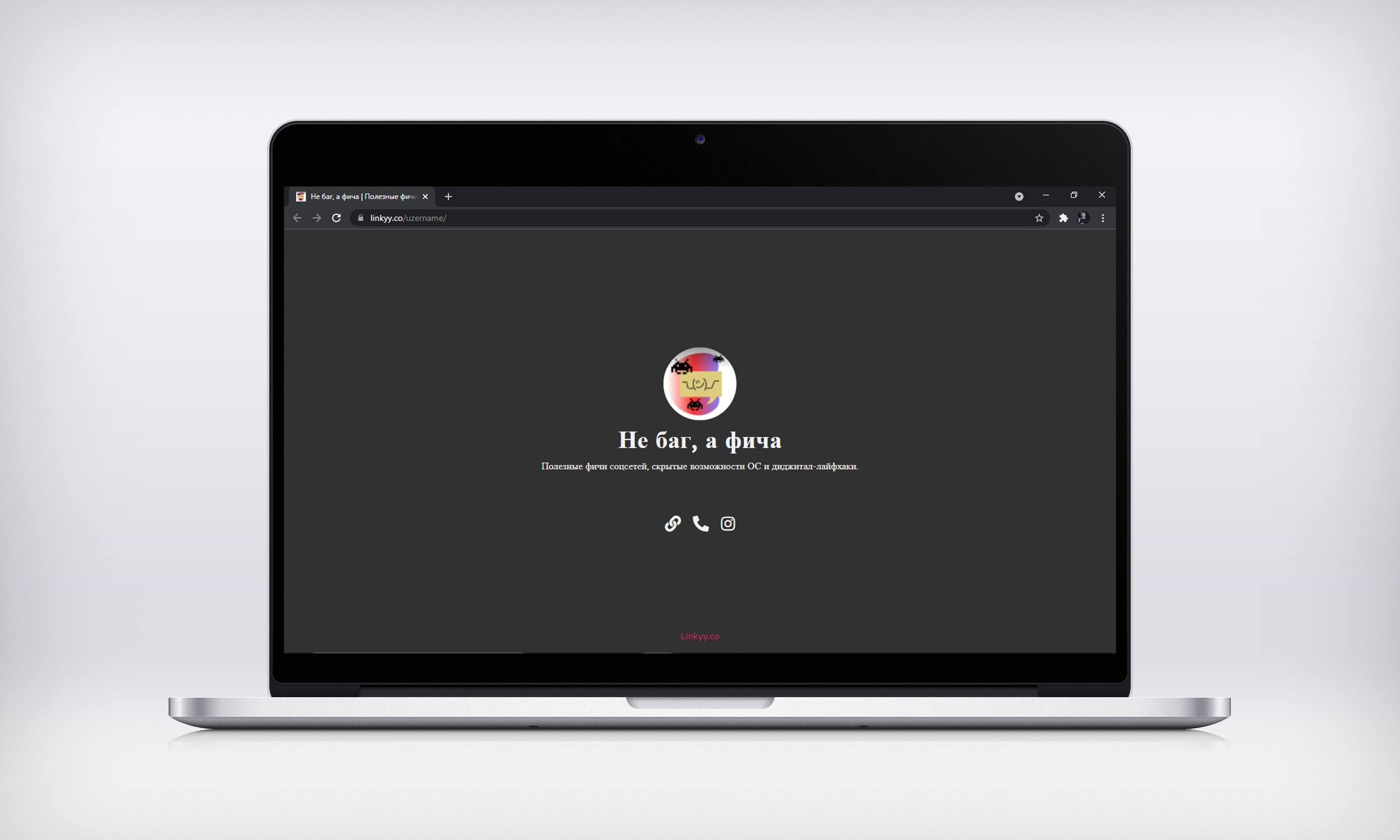 Простой и бесплатный сервис Linkyy для создания сайта-визитки для себя или вашей компании за несколько кликов. Никакой код писать не нужно. Сервис позволяет создать минималистичную веб-страницу, в котором будут храниться ваши контакты и ссылки на соцсети.