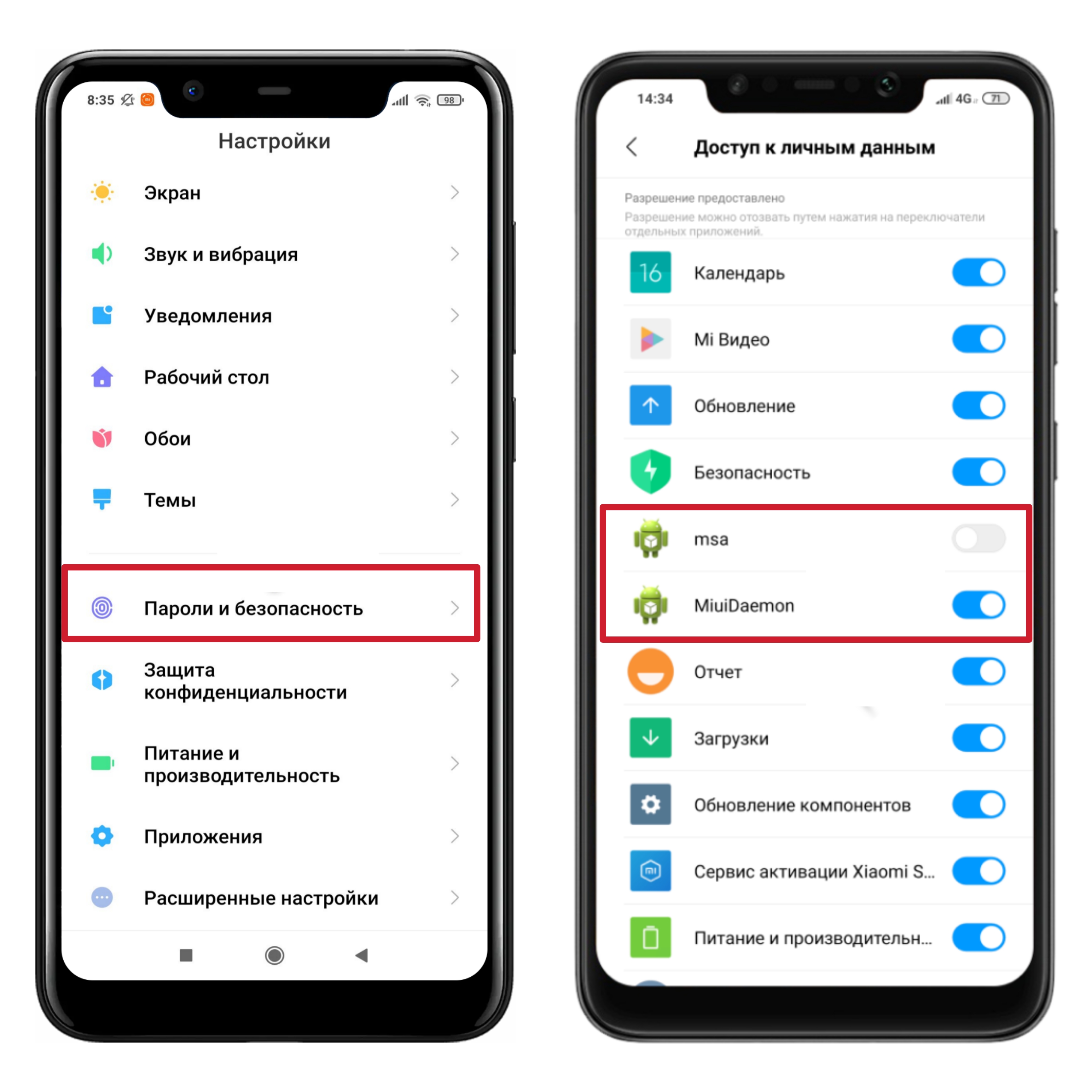 2. Отключаем компоненты "msa" и "MiuiDaemon".