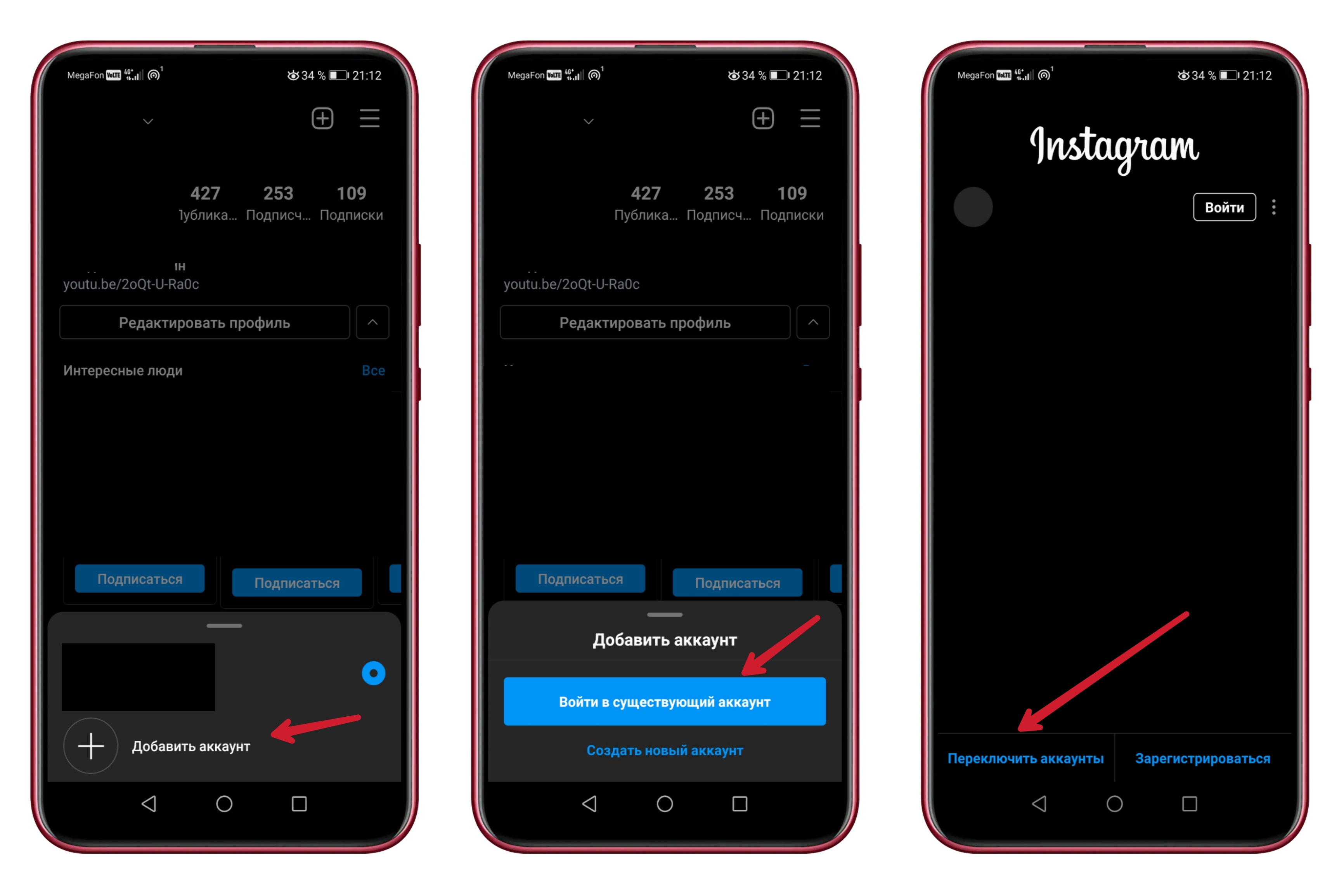 2. Жмем на кнопку "Войти в существующий аккаунт", а затем — "Переключить аккаунты".