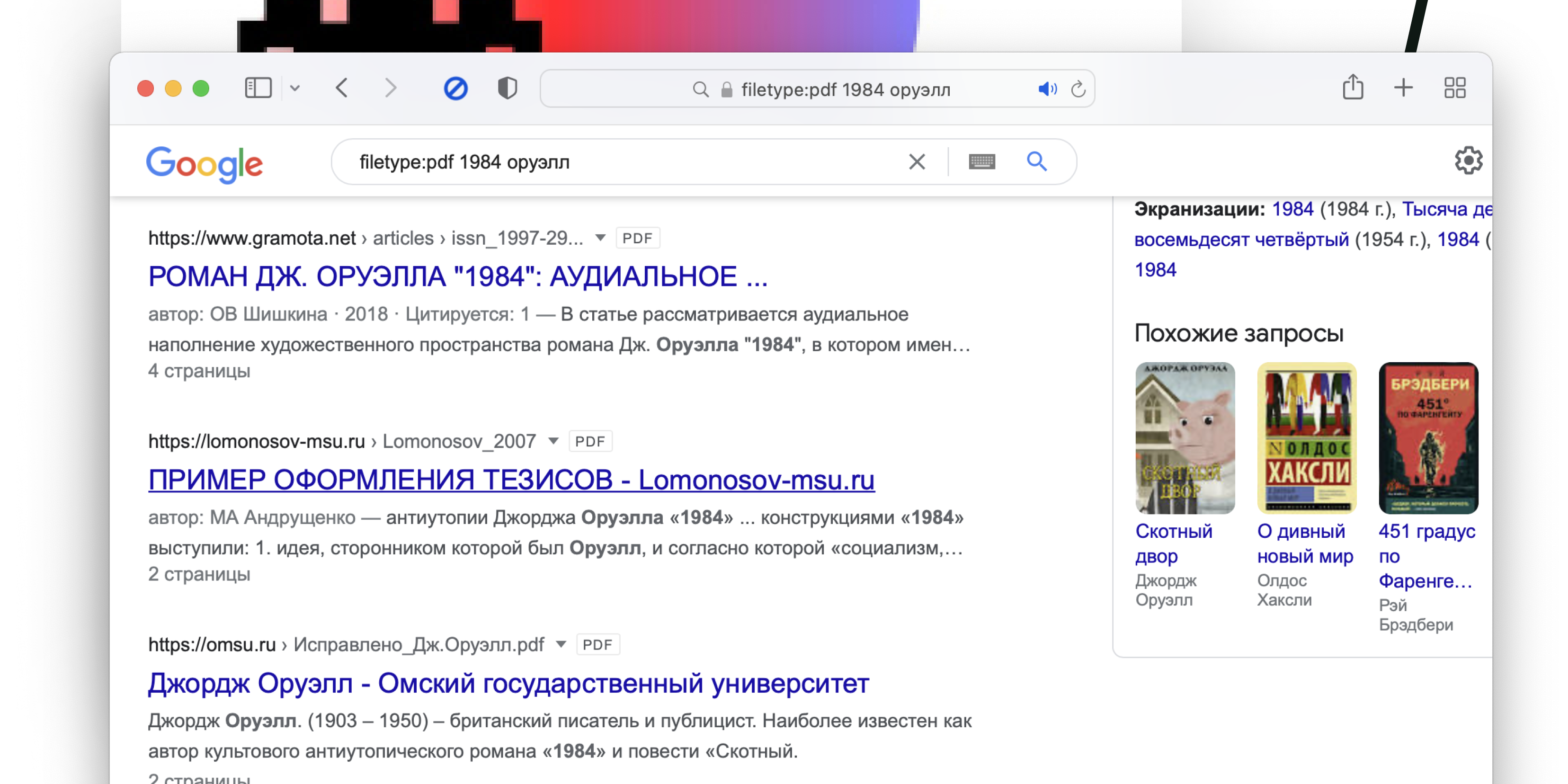 3. Например, должно получиться так: «filetype:pdf 1984 оруэлл». Этот запрос моментально найдёт культовый роман в формате pdf.