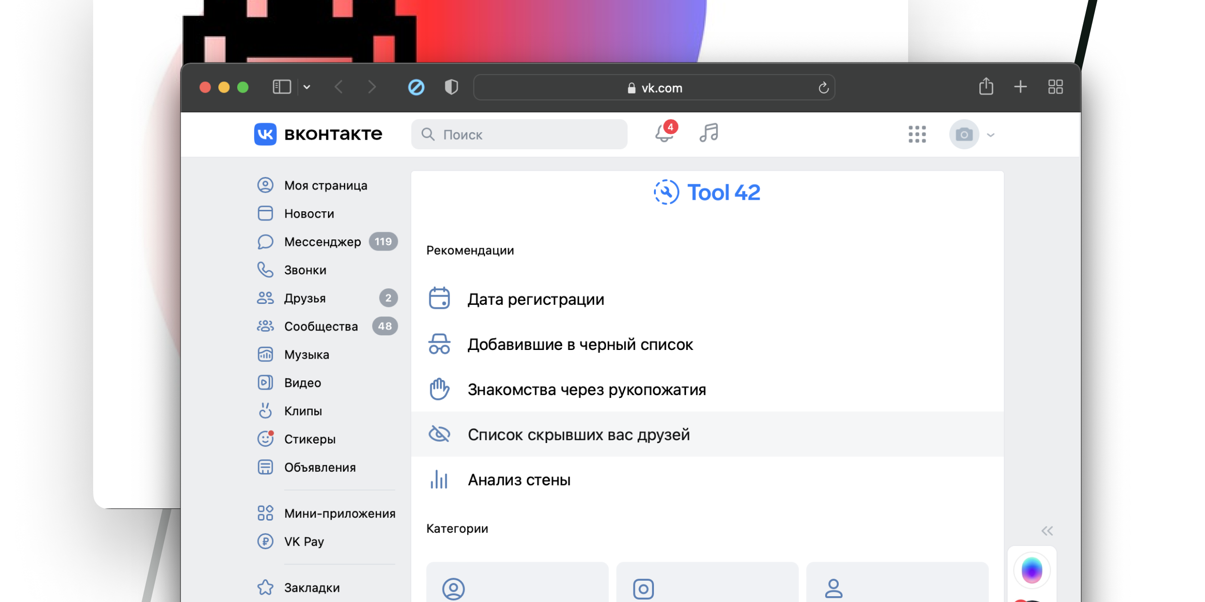 Если вы хотите попробовать скрытые функции ВКонтакте — воспользуйтесь приложением Tool 42. Помимо прочего, здесь есть анализ стены, друзей, сообществ и многое другое.