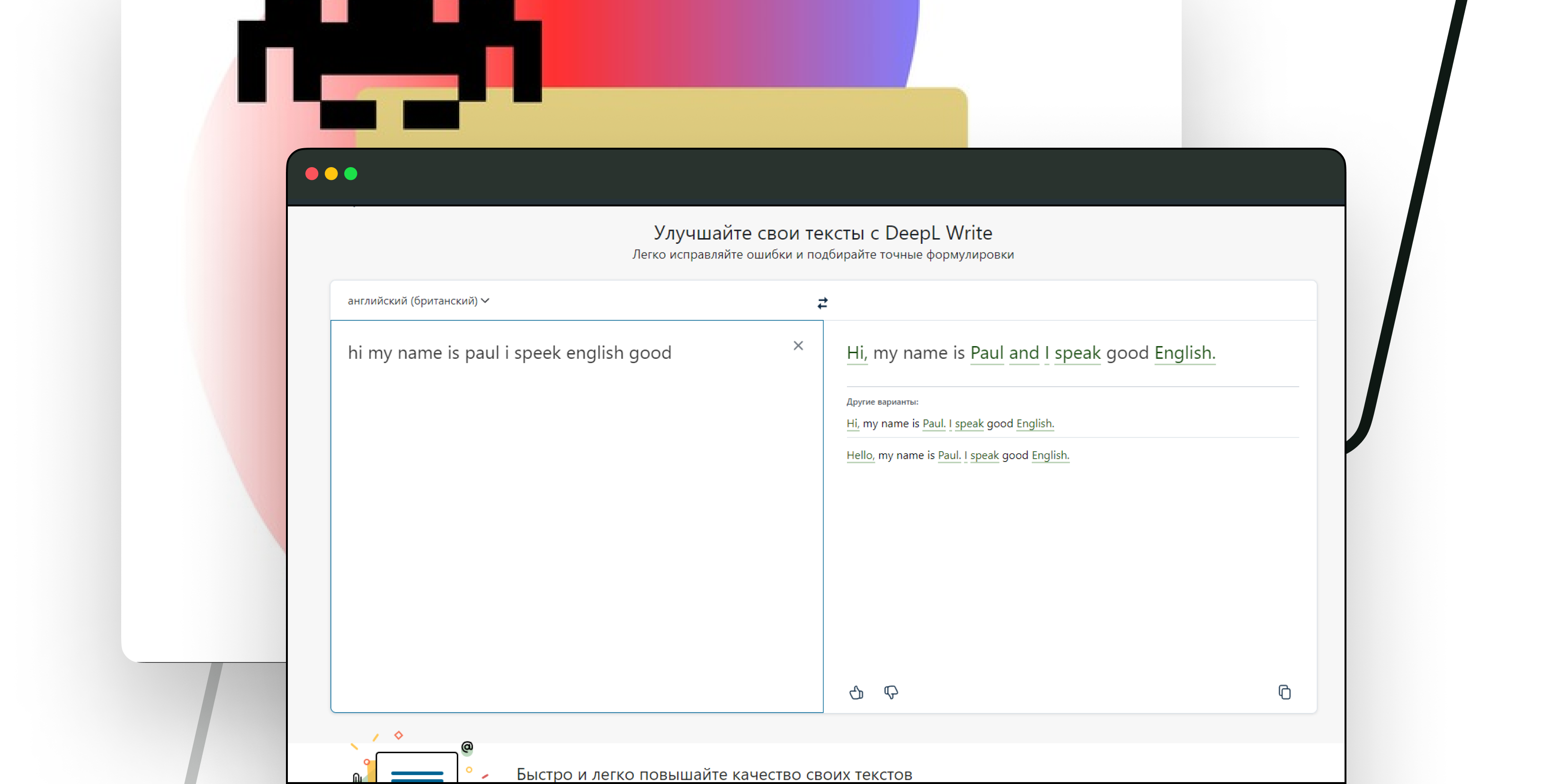 Если вы пишите на английском языке письма, резюме, эссе или общаетесь с иностранцами — воспользуйтесь полезным сервисом Write от DeepL. Он бесплатно исправляет грамматические ошибки в тексте и предлагает варианты по его улучшению, а также работает в несколько раз точнее, чем альтернативы.