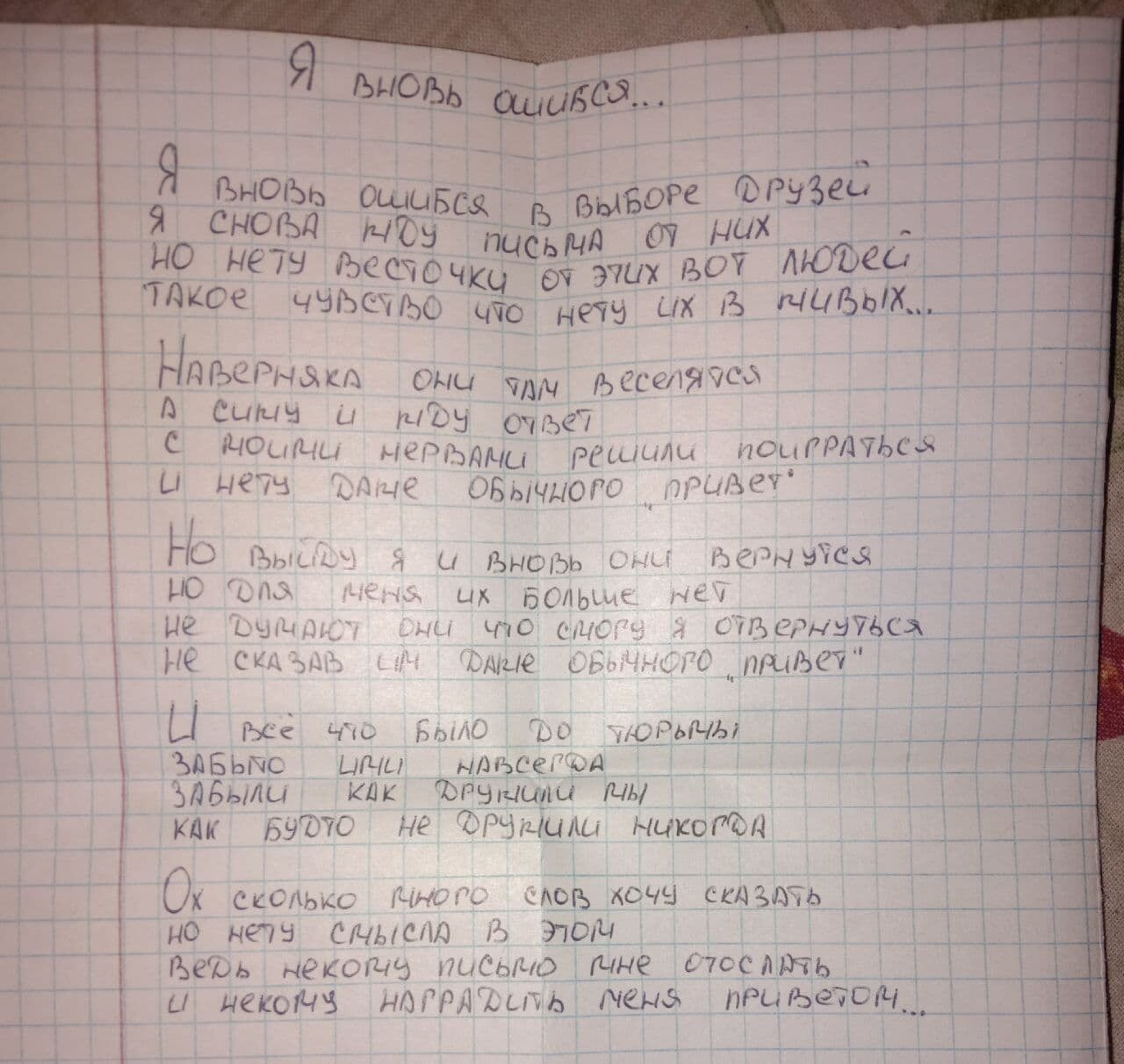 Именно это читается сквозь строки в письме Даниила. А как расценить то, что тебе не пишут? Наверное веселятся там, уже забыли о тебе. И тебя забыли и все. Конечно, это не так. Не отступились, не забыли. Просто настолько явно не понимается, что письма политзекам, даже от незнакомых людей, но при этом единомышленников в главном — в стремлении к освобождению Беларуси от режима, настолько важны. Важны для тех, кто каждое утро просыпаются на тюремной койке.