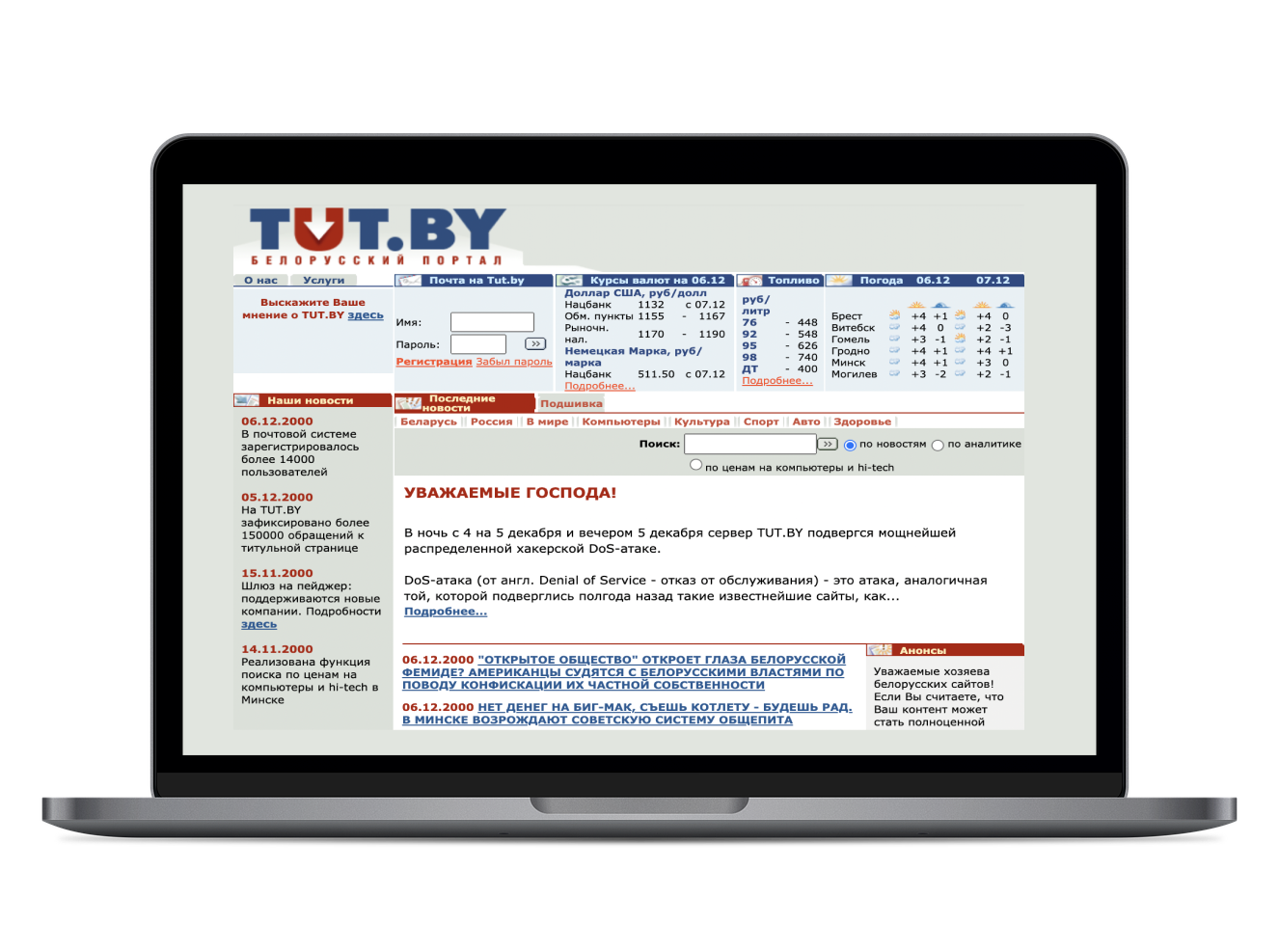 Вряд ли кто помнит, как выглядел TUT.by 21 год назад. И, наверное, совсем единицы помнят о том, что впервые электронная почта в Беларуси стала бесплатной именно на TUT.by. Да, в самом начале почта в байнете была платной. Юрий Анатольевич (Ю. А. Зиссер — основатель TUT.by.) говорил: «На ведущих мировых порталах почта бесплатна, значит и у нас будет бесплатной». Так с самого своего основания и до сих пор TUT.by лидирует во всем лучшем и инновационном, оставаясь для нас самым авторитетным информационным источником страны.
