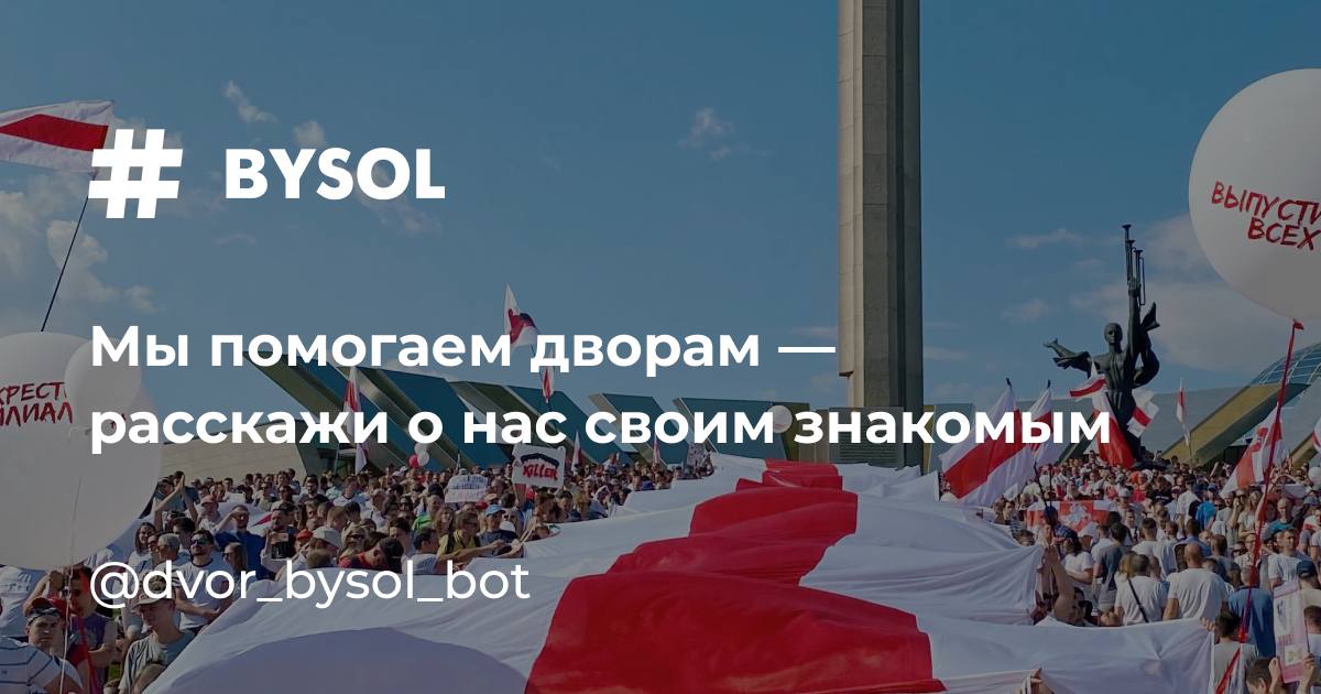 ❗️Сейчас мы просим помощи у вас в распространении нашего бота. Мы хотим, чтобы как можно больше дворов узнало о том, что мы готовы им помочь. Расскажите о нашем боте своим знакомым активистам или обращайтесь за помощью сами. А если у вас появились какие-то вопросы по заполнению заявки либо любые другие — пишите в наш аккаунт для помощи инициативам — @bysol_help. ⠀