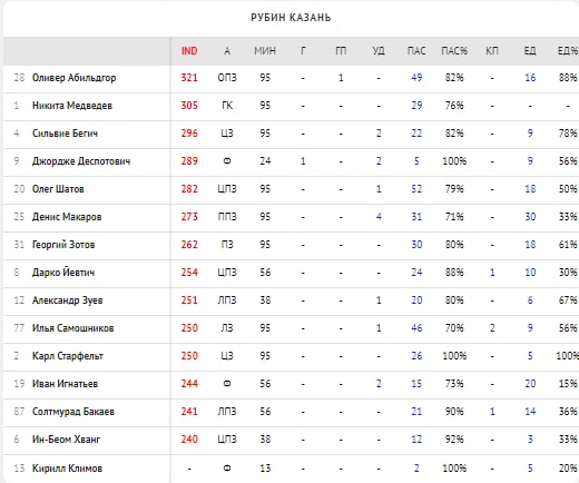 📌Кротов (372), Жиго (369) и Жамалетдинов (364) - тройка лучших игроков в туре по индексу Instat.