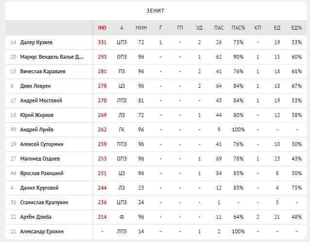 3️⃣место по индексу Instat в РПЛ - 279 баллов