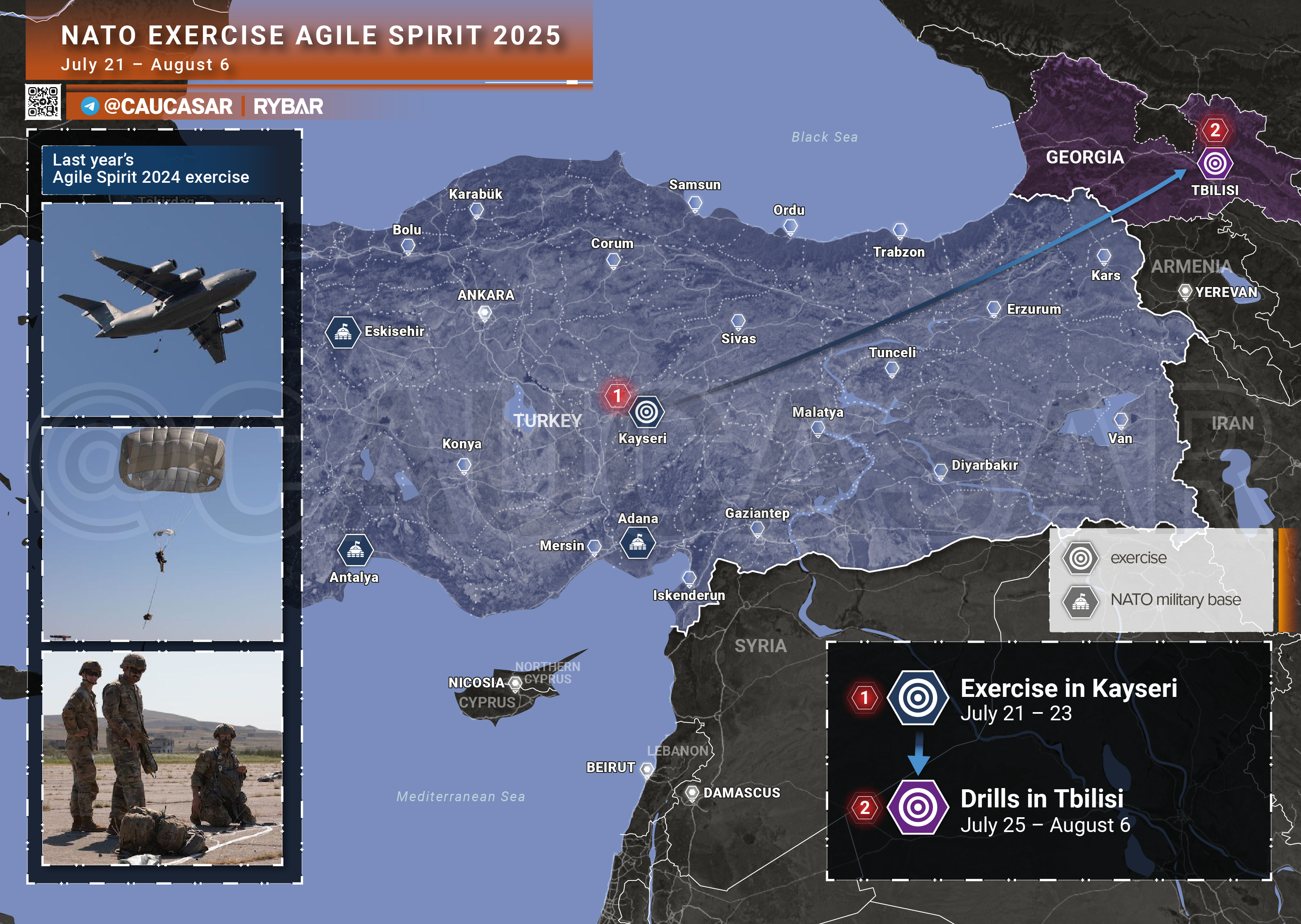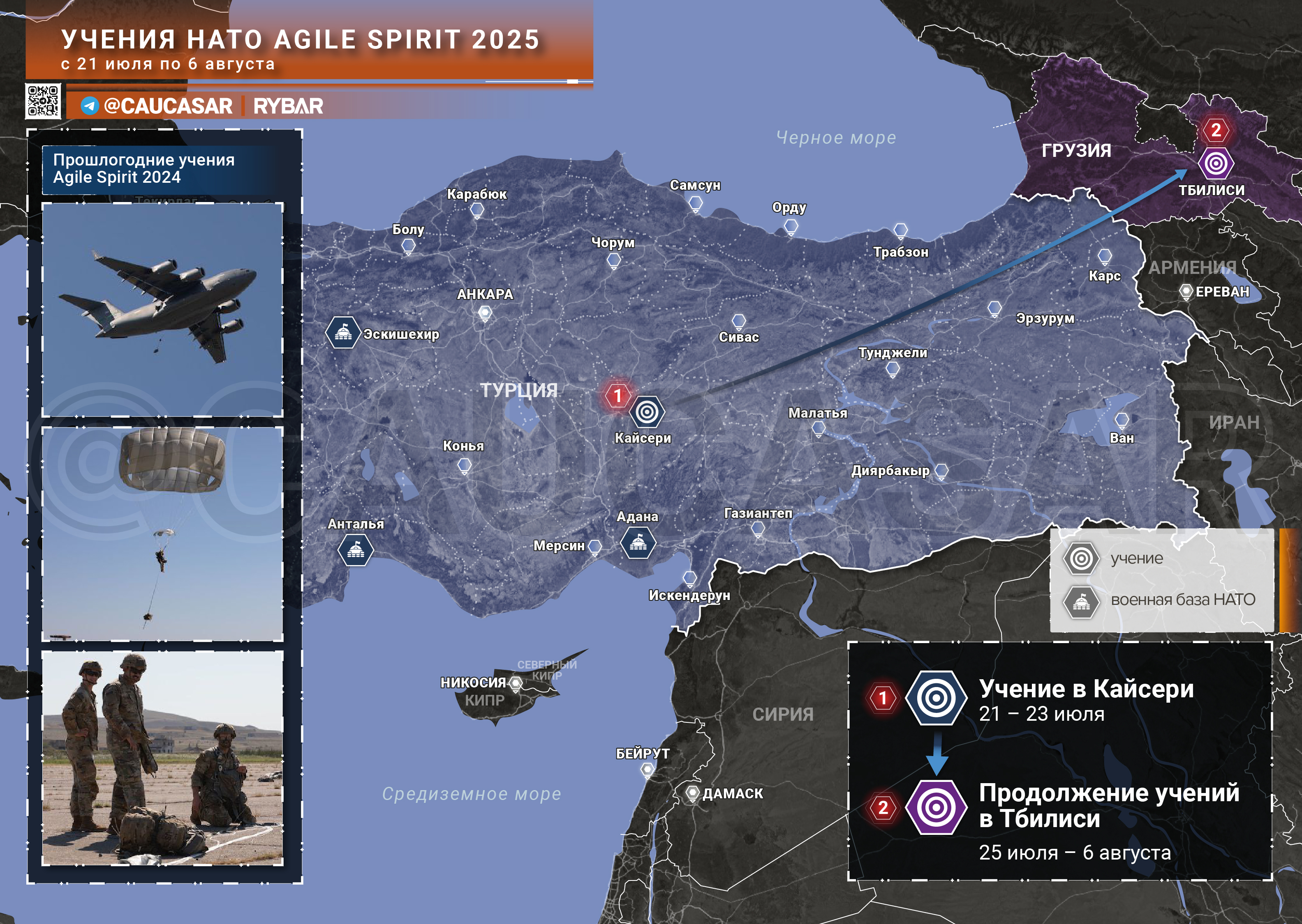 В июле-августе Южный Кавказ и Черноморье вновь становятся ареной военной активности НАТО. Под эгидой командования ВС США стартуют учения Agile Spirit-2025. Главная цель — отработка взаимодействия союзников против России.