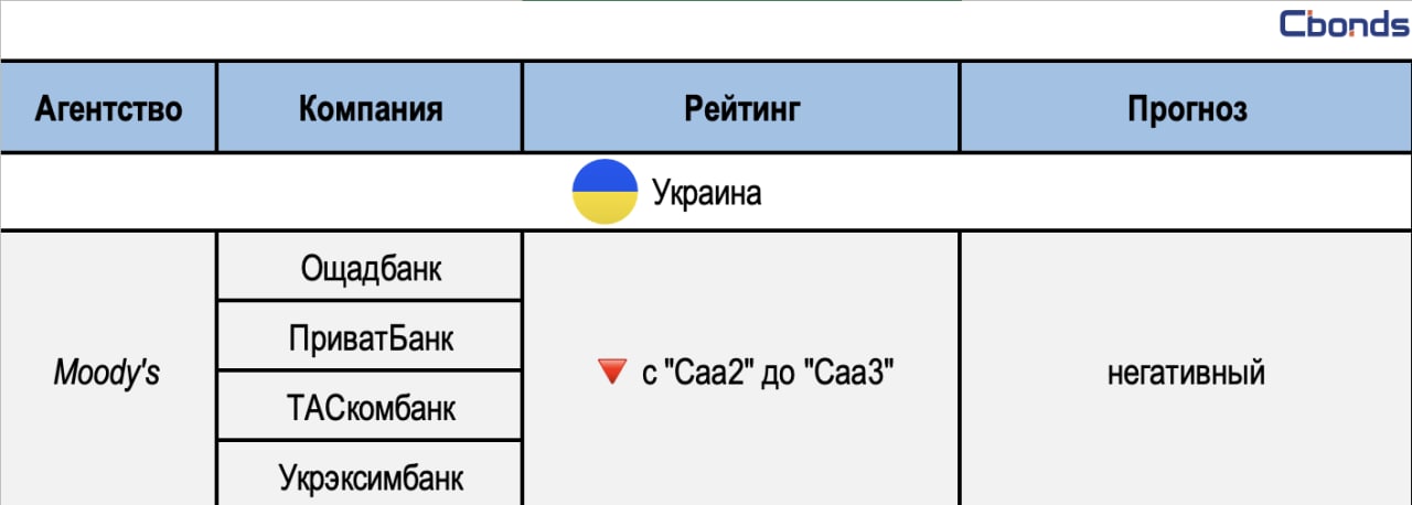 🏦Ощадбанк, ПриватБанк, ТАСкомбанк, Укрэксимбанк: «Понижение рейтингов обусловлено снижением суверенного рейтинга Украины до «Caa3» с «Caa2» с «негативным» прогнозом». (Пресс-релиз Moody's Investors Service)